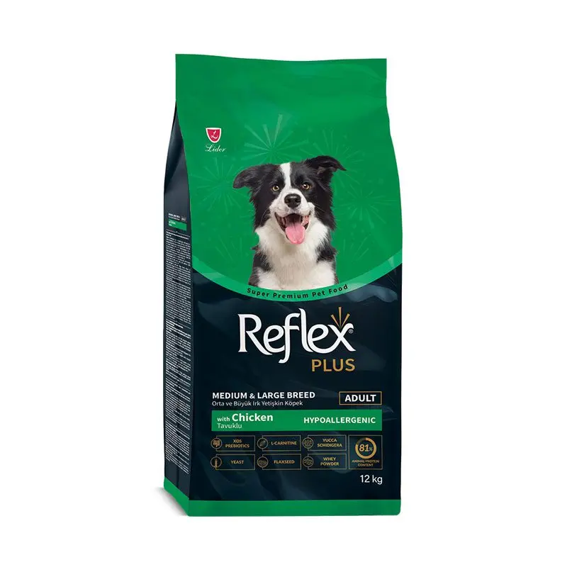 غذای خشک سگ نژاد متوسط و بزرگ رفلکس با طعم مرغ، محصولی سوپر پریمیوم از برند ترکیهای Reflex Plus است که برای سگهای بالغ نژاد متوسط و بزرگ (۱۸-۲۴ ماه تا ۷ سال) طراحی شده. این غذا با پروتئین مرغ (۲۴%)، برنج، L-کارنیتین و امگا ۳/۶، وزن سالم رو حفظ کرده، هضم رو بهبود میبخشد و انرژی روزانه رو تأمین میکند. طعم لذیذ مرغ اشتها رو تحریک کرده و با پریبیوتیکها، فلور روده رو سالم نگه میداره.