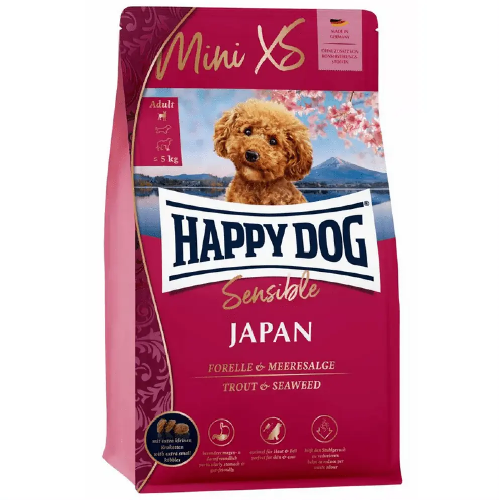 غذای خشک سگ هپی داگ مدل Mini Xs Japan با ترکیب منحصر به فرد از قزل آلای خوشمزه، مرغ و جلبک دریایی تولید می شود. این دستور غذایی یک طعم دلچسب و سالم برای سگ های بسیار کوچک را به همراه میاورد. این غذا به دلیل وجود ترکیباتی مانند تفاله سیب و کتان علاوه بر حفظ سلامت معده و روده از قابلیت هضم بالایی نیز برخوردار می باشد.